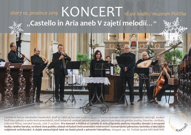Castello in Aria je sdružením hudebníků, kteří se zabývají barokní hudbou provozovanou na kopie dobových hudebních nástrojů. Slovní hříčkou v názvu souboru vzdávají hold svému oblíbenému skladateli jménem Dario Castello a zároveň vyjadřují pocit z hudby, kterou hrají, neboť italské sousloví lze přeložit do češtiny jako vzdušný zámek nebo přelud. Uvedené podobenství vysvětlují slovy: po dobu, kdy naše hudba zní, je velmi skutečná, a když utichne, rozplyne se a zůstane jen vzpomínka. Soubor tvoří dva zpěváci a sedm instrumentalistů, kteří brilantně ovládají takové nástroje, jakými jsou viola da gamba, loutna, theorba, cembalo, zobcové flétny, barokní housle, cink či sackbut. Pro koncert v Poličce si Castello in Aria připravilo pestrou mozaiku domácí a evropské hudby raného baroka, ve které chce publiku ukázat virtuózní instrumentální mistrovství i koncertantní pěveckou techniku a také jejich vzájemné ovlivňování. A dojde samozřejmě také na české písně s adventní tématikou.